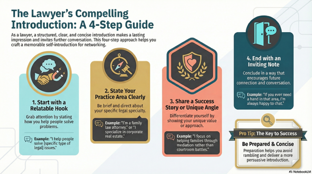 - Mention your practice area clearly: Just a brief line like, “I’m a family law attorney,” or “I specialize in corporate real estate.”